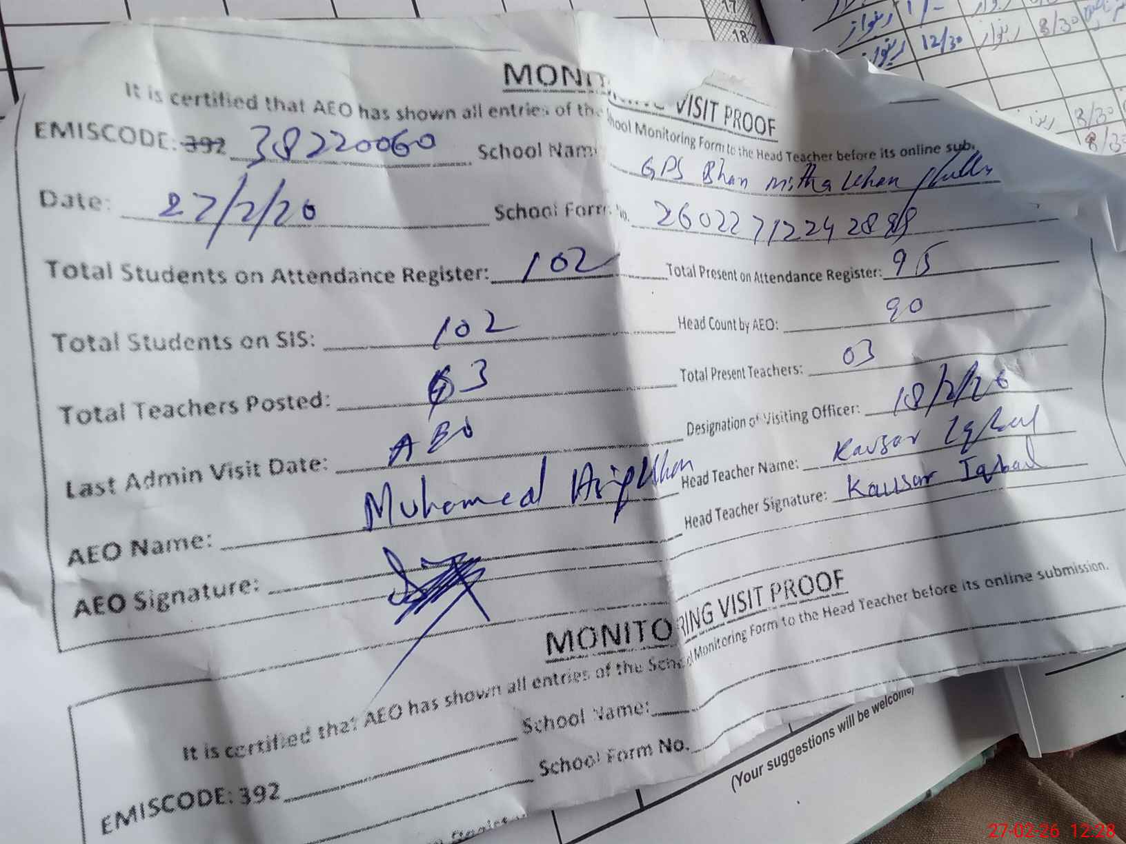 | Attendance Register | Head Teacher | MEA with School | Visit Proof |