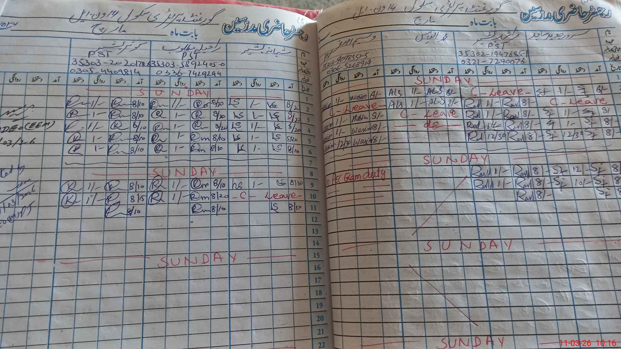 | 35**** | Wa**** As**** | PST Arts | Regular | 0 | 0 | 0 | 0 | 0 | 0 | 0 | 0 | 0 | Exam Duty |