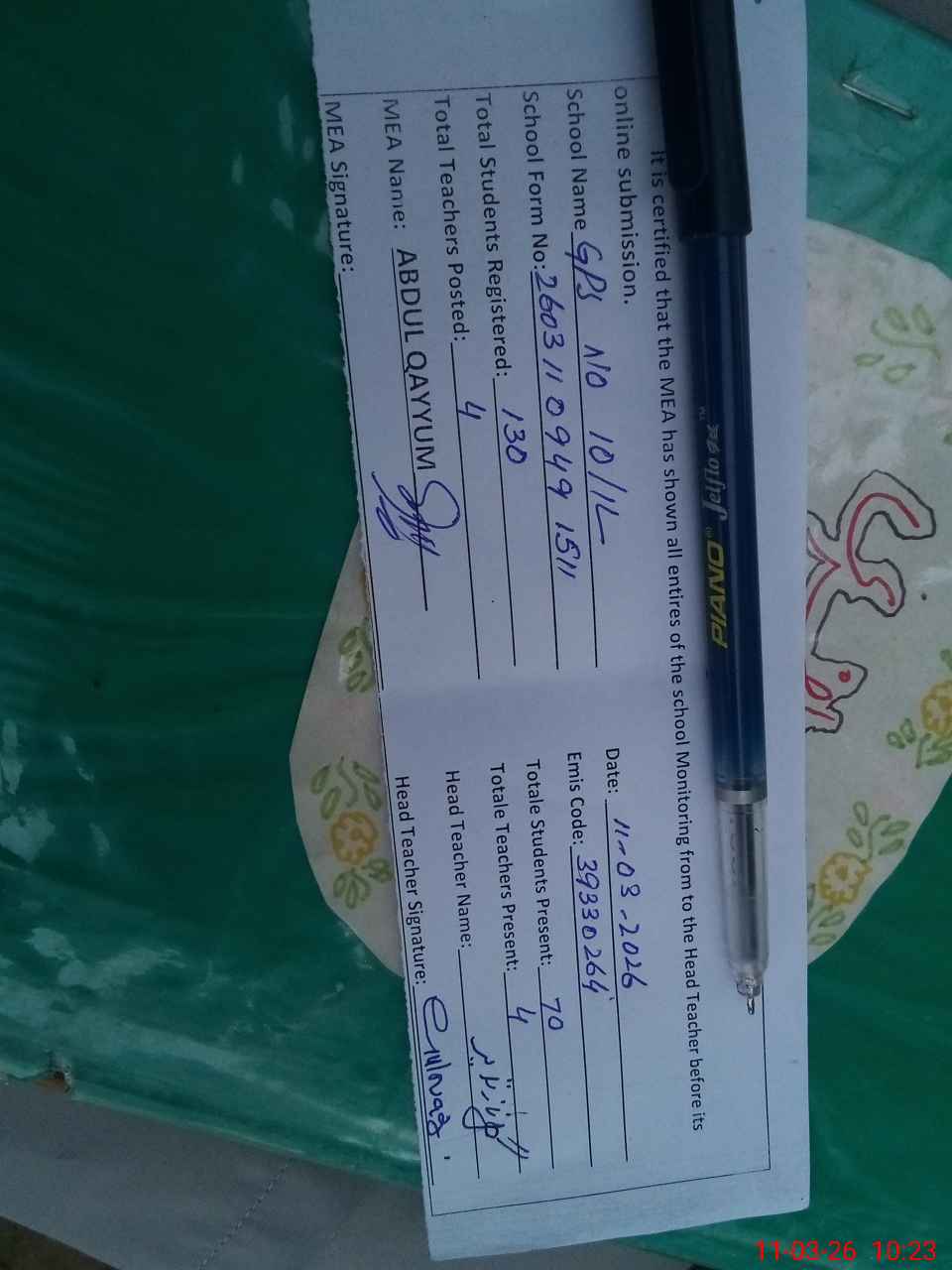 | Attendance Register | Head Teacher | MEA with School | Visit Proof |