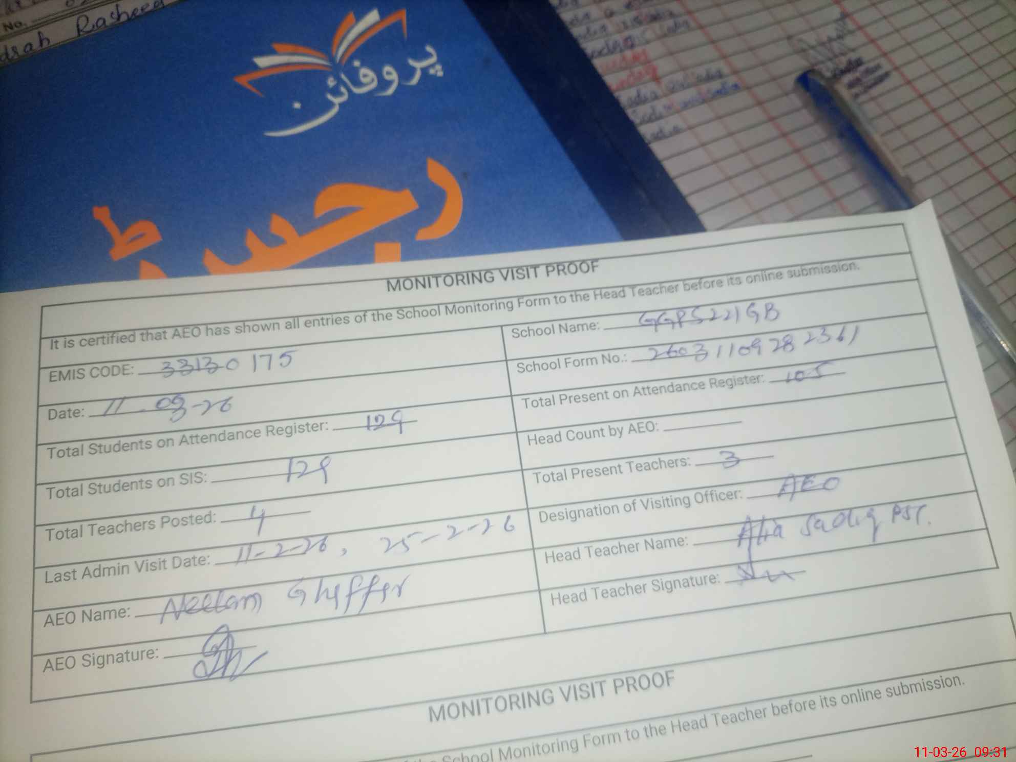 | Attendance Register | Head Teacher | MEA with School | Visit Proof |