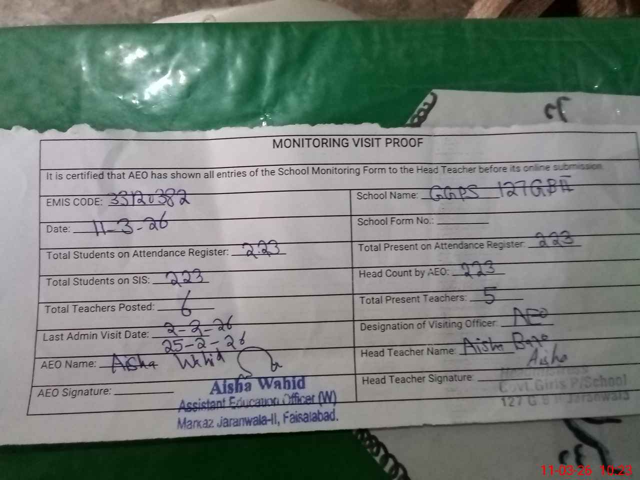 | EMIS Code: 33120382 | Name of School: GGPS CHAK 127 GB II JARANWALA | |||