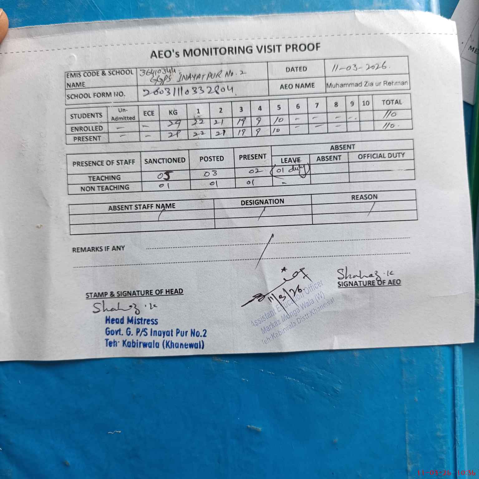 | EMIS Code: 36410344 | Name of School: GGPS INAYAT PUR NO.2 KABIRWALA | |||