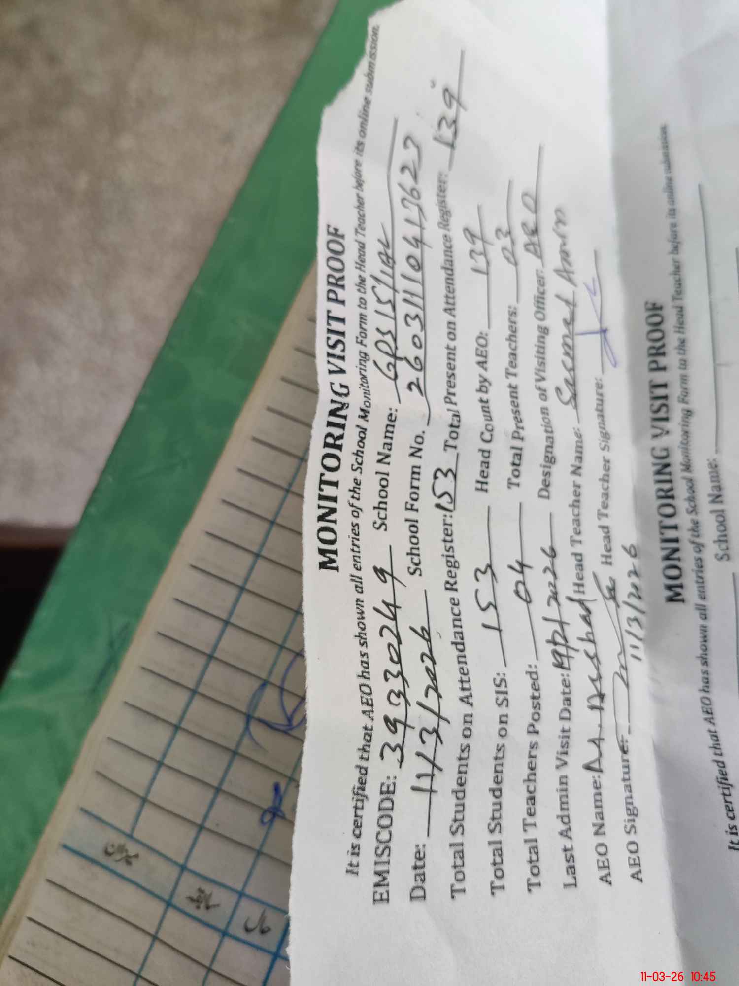 | Attendance Register | Head Teacher | MEA with School | Visit Proof |