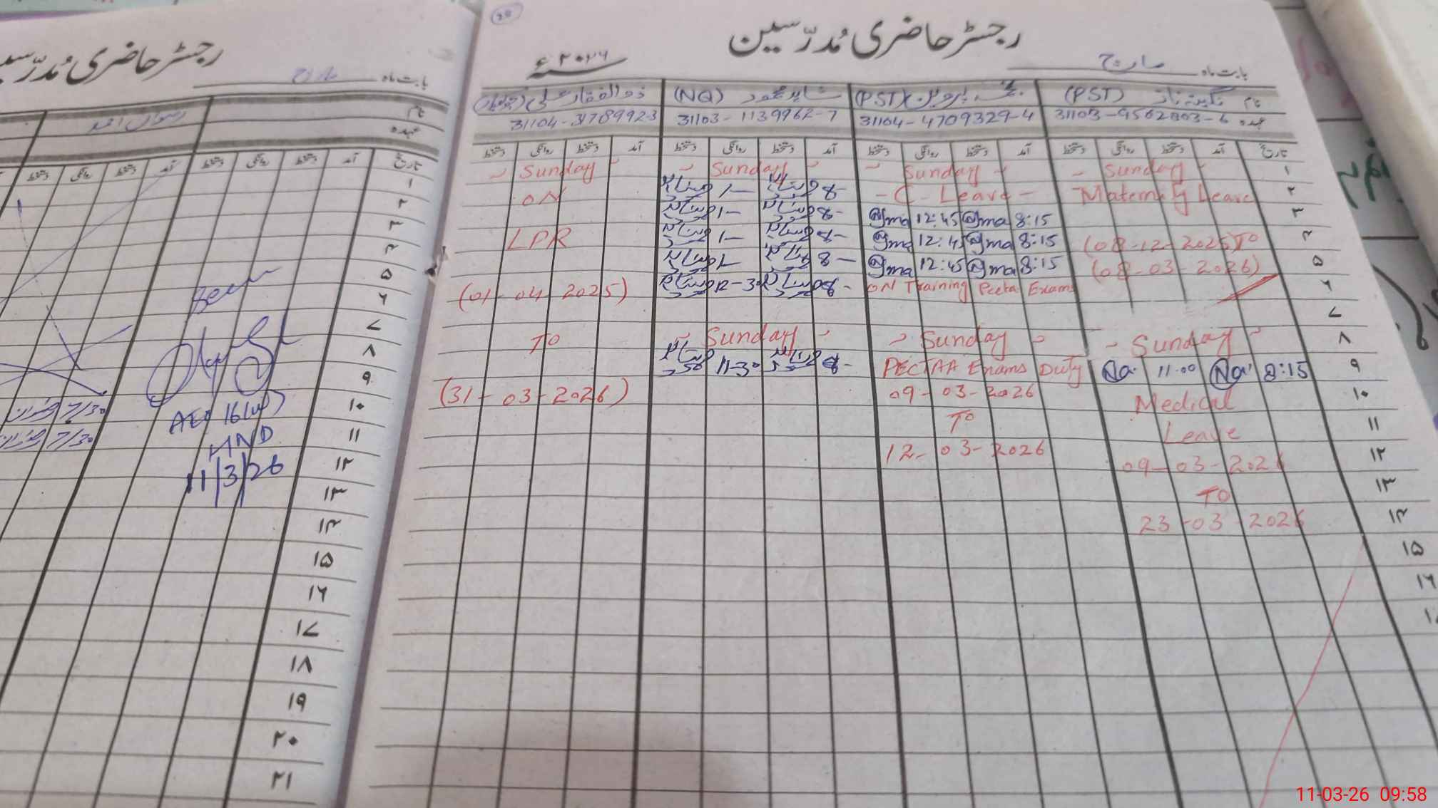 | 31**** | Na**** Pe**** | PST Arts | Regular | 0 | 0 | 0 | 0 | 0 | 0 | 0 | 0 | 0 | Exam Duty |