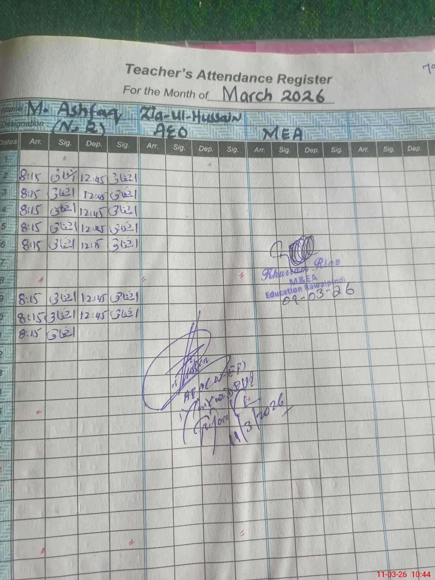 | Monitoring Date: 11-03-2026 | Start Time: 11-03-2026 10:30 AM | End Time: 11-03-2026 10:45 AM | Name of MEA: Zi**** ulHu**** | |