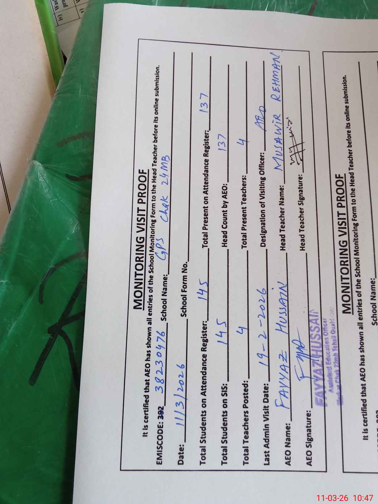| Attendance Register | Head Teacher | MEA with School | Visit Proof |