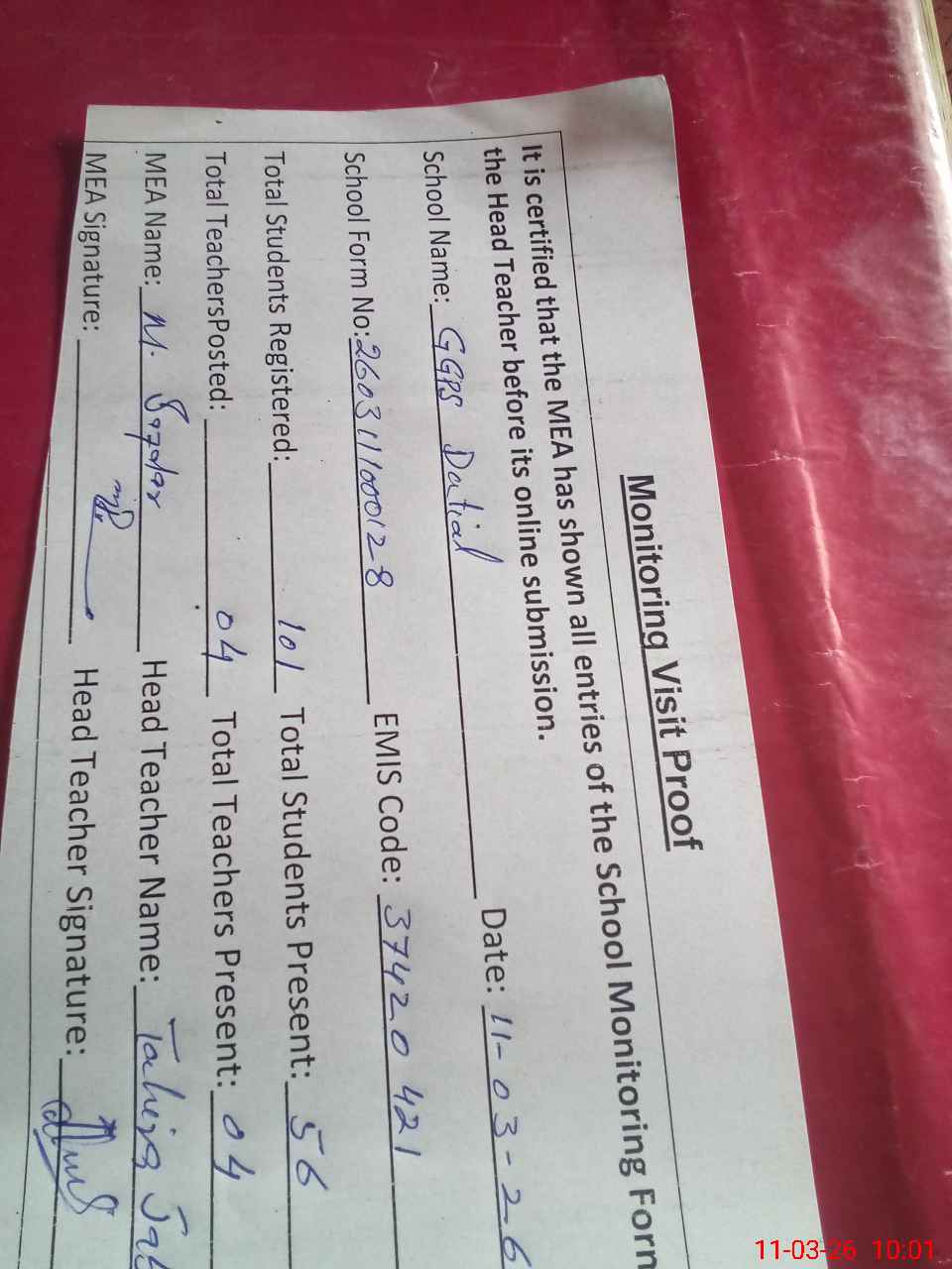 | Attendance Register | Head Teacher | MEA with School | Visit Proof |