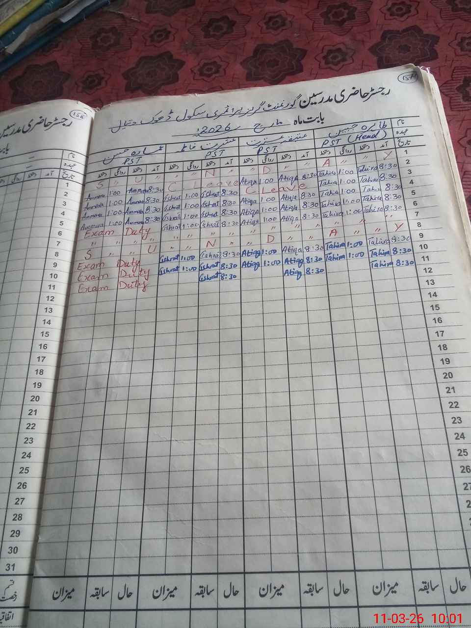 | Leave | Duty | Absent | Maternity | Medical | Ex- Pak |