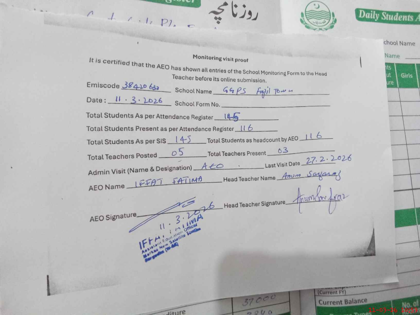 | Attendance Register | Head Teacher | MEA with School | Visit Proof |