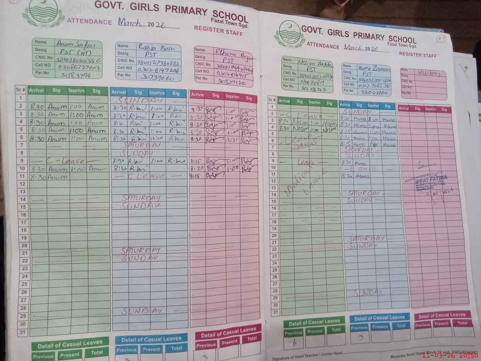 | CNIC | Full Name | Designation | R/C | Absence During Last Calender Month |