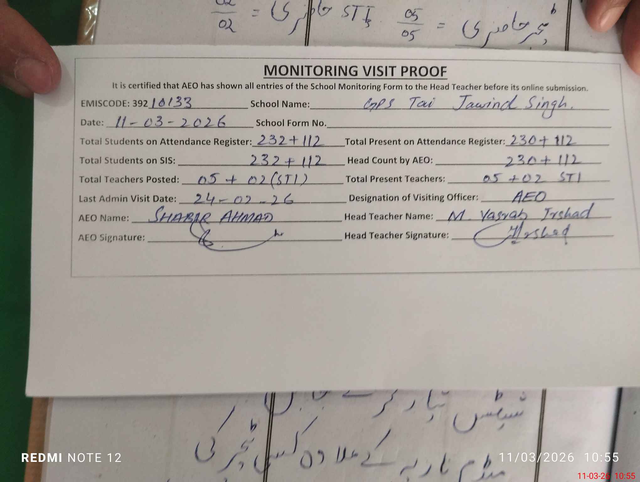 | Attendance Register | Head Teacher | MEA with School | Visit Proof |