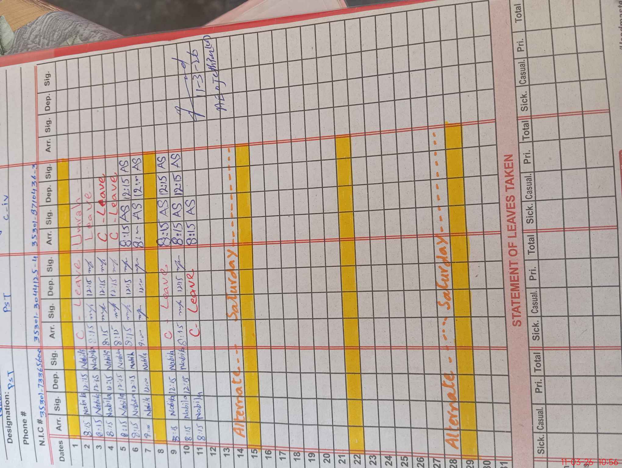 | CNIC | Full Name | Designation | R/C | Absence During Last Calender Month |