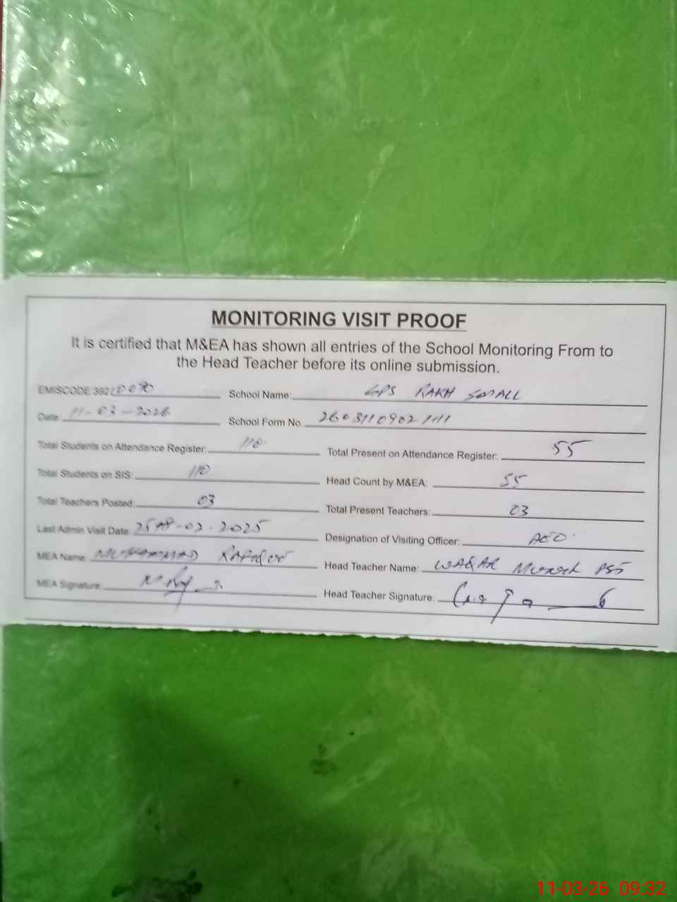 | Attendance Register | Head Teacher | MEA with School | Visit Proof |
