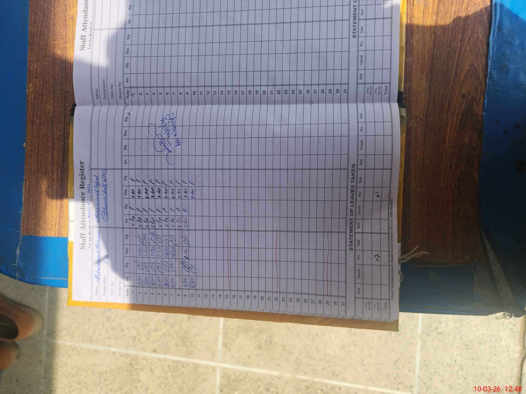 | CNIC | Full Name | Designation | R/C | Absence During Last Calender Month |