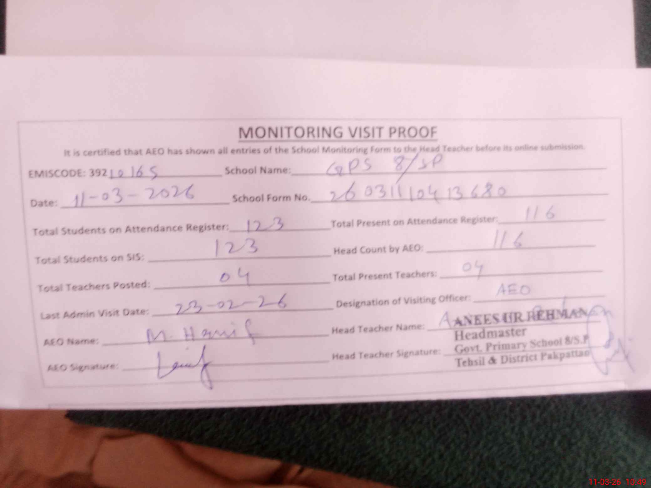 | Attendance Register | Head Teacher | MEA with School | Visit Proof |