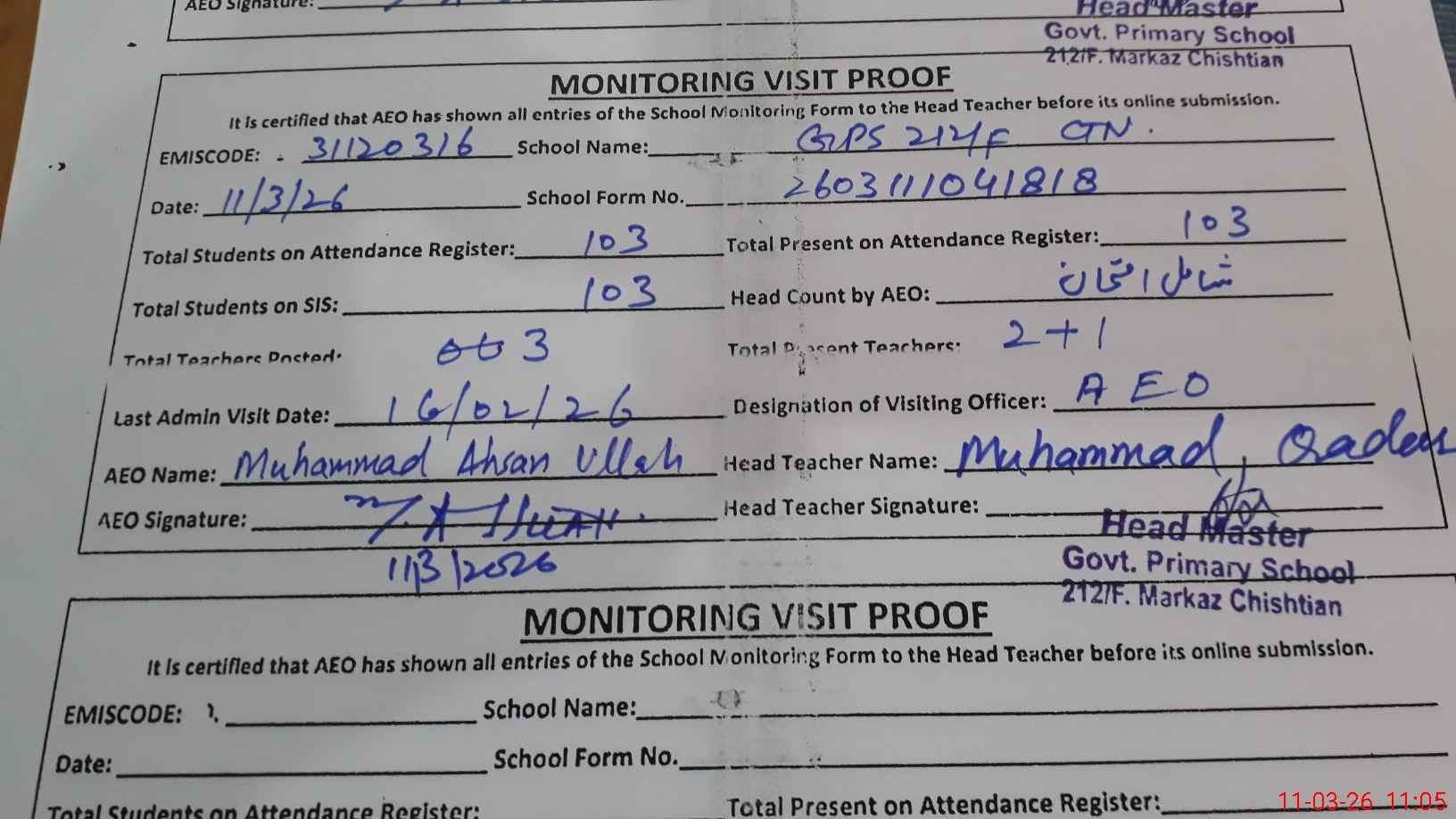 | Monitoring Date: 11-03-2026 | Start Time: 11-03-2026 10:28 AM | End Time: 11-03-2026 11:05 AM | Name of MEA: Mu**** Ah**** Ul**** | |