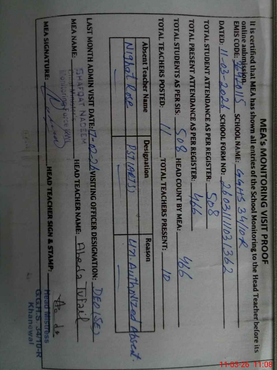 | Attendance Register | Head Teacher | MEA with School | Visit Proof |