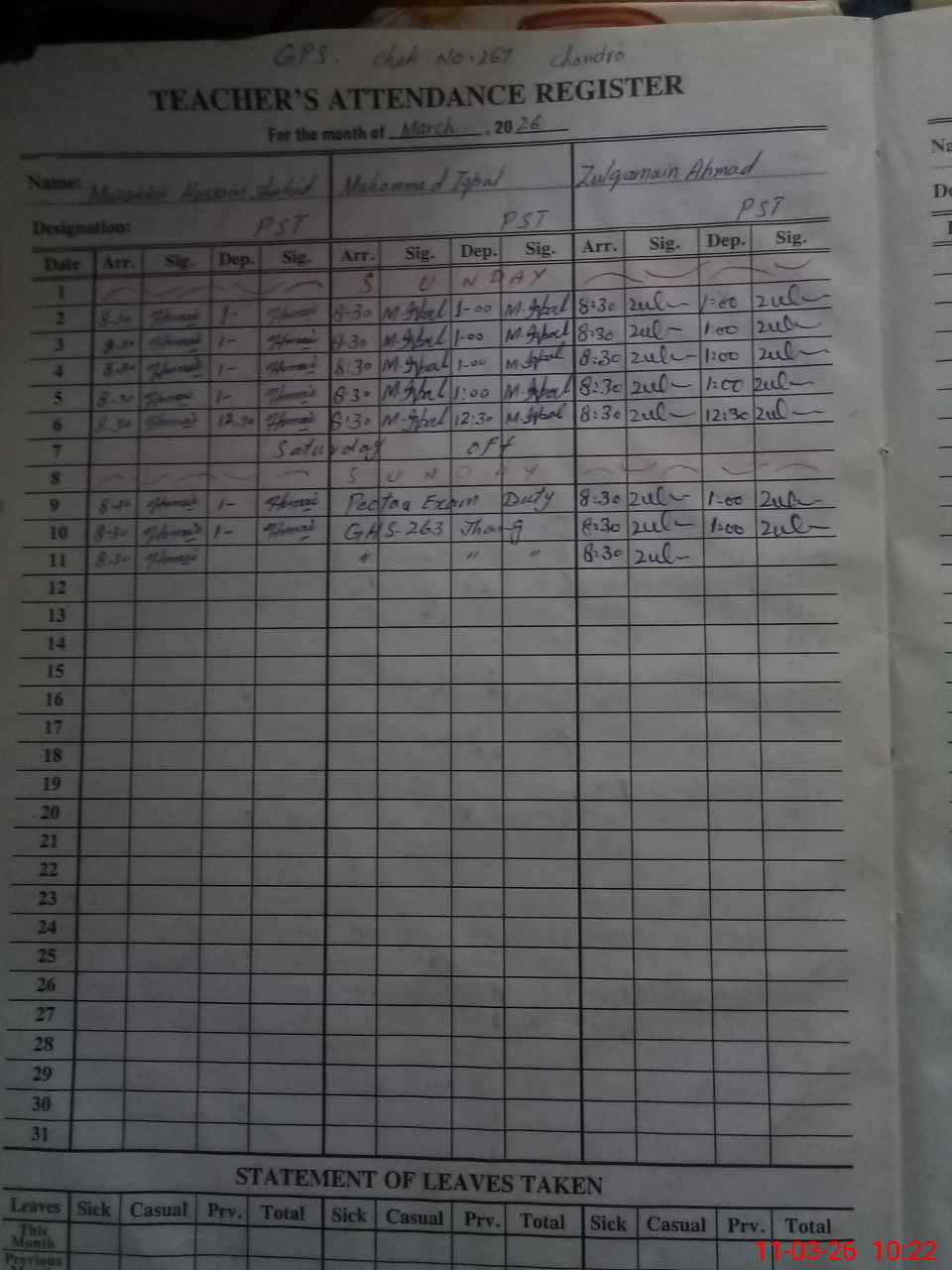 | 33**** | Mu**** Iq**** | PST Arts | Regular | 0 | 0 | 0 | 0 | 0 | 0 | 0 | 0 | 0 | Exam Duty |