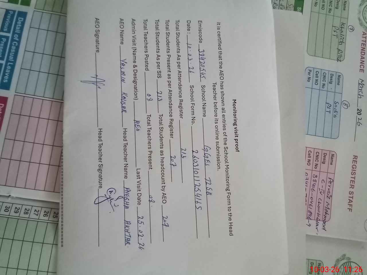 | Attendance Register | Head Teacher | MEA with School | Visit Proof |