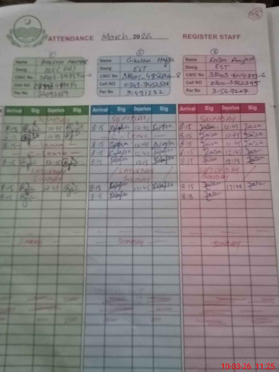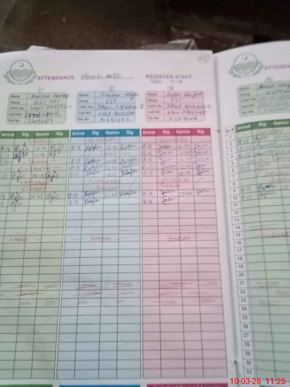 | CNIC | Full Name | Designation | R/C | Absence During Last Calender Month |