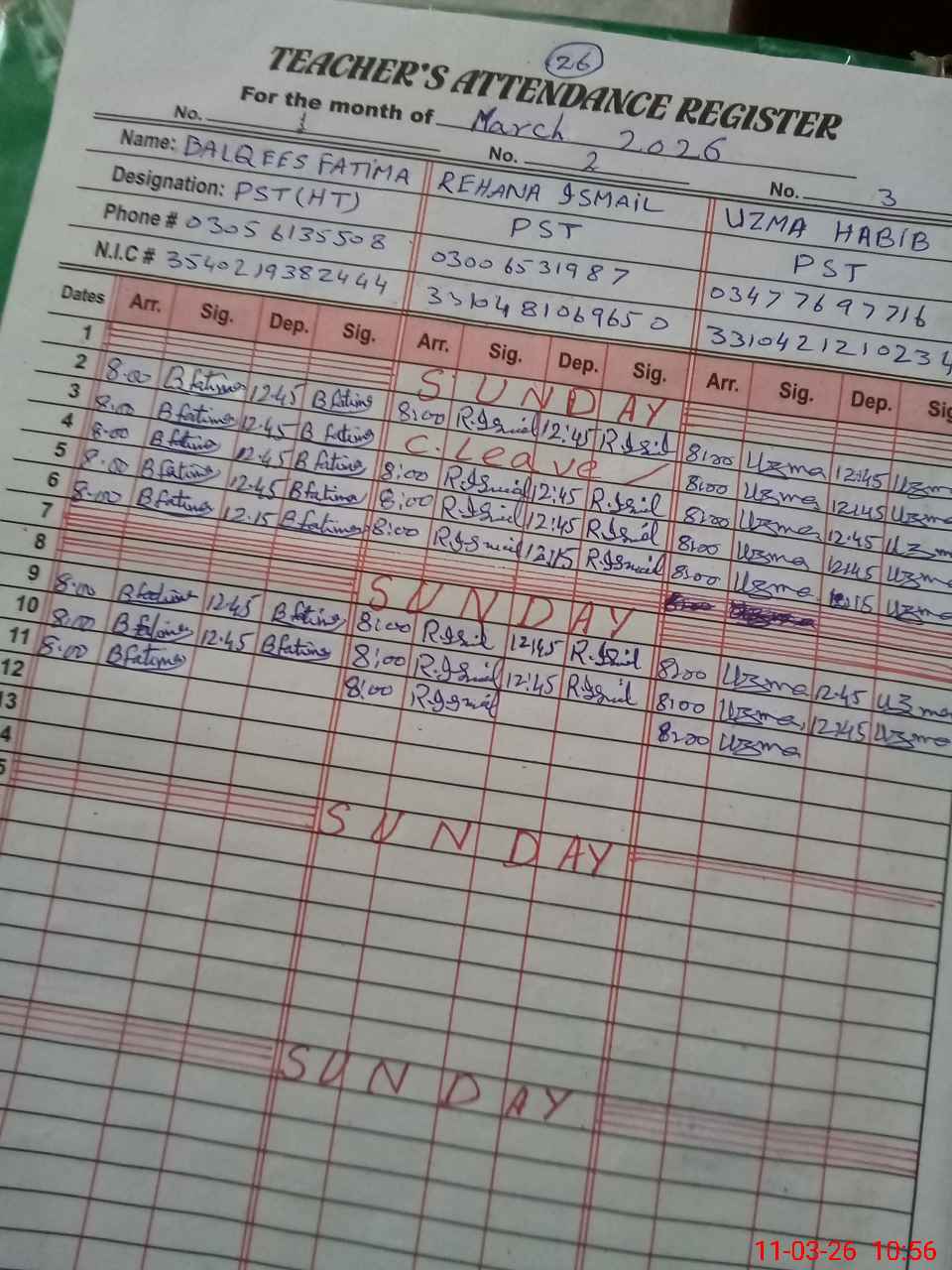 | CNIC | Full Name | Designation | R/C | Absence During Last Calender Month |