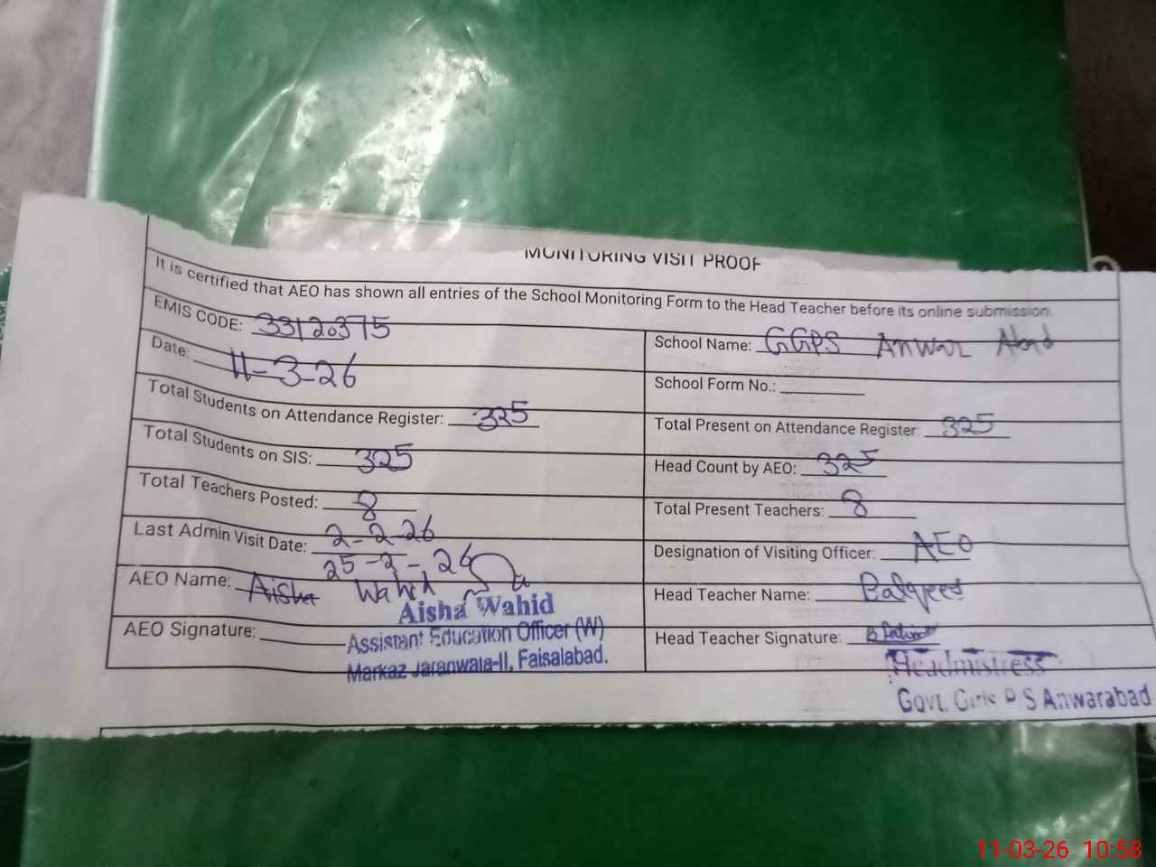 | EMIS Code: 33120375 | Name of School: GGPS ANWAR ABAD JARANWALA | |||