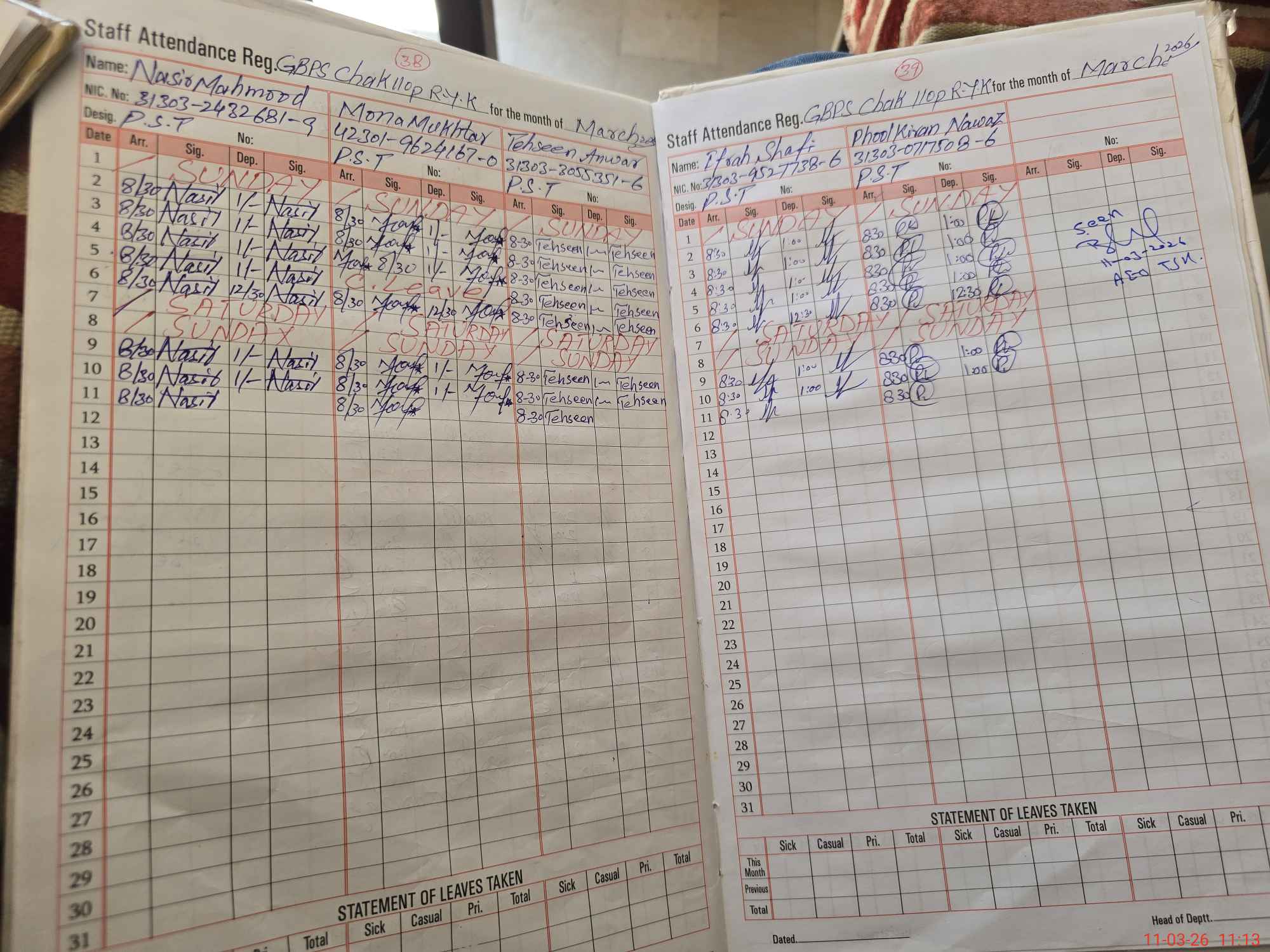 | CNIC | Full Name | Designation | R/C | Absence During Last Calender Month |