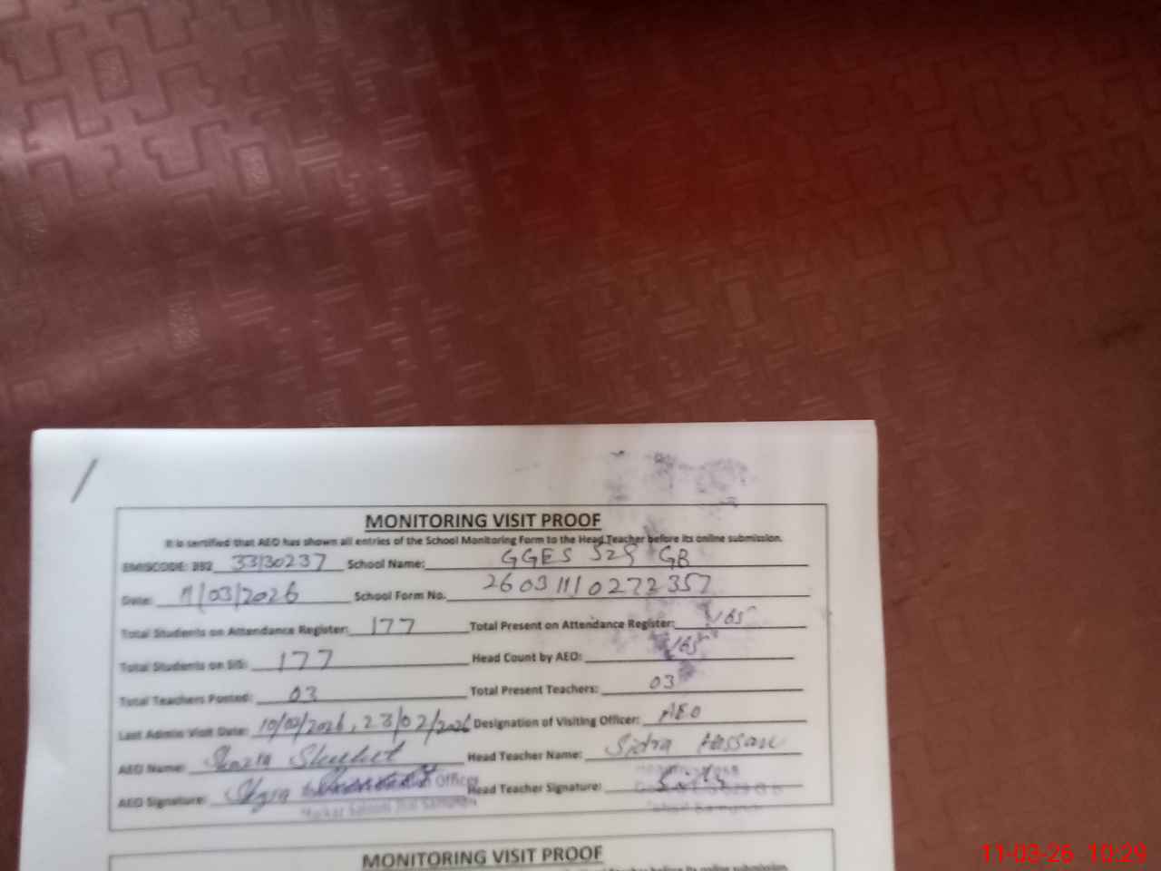 | Attendance Register | Head Teacher | MEA with School | Visit Proof |