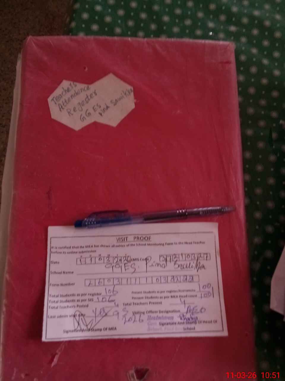 | Attendance Register | Head Teacher | MEA with School | Visit Proof |