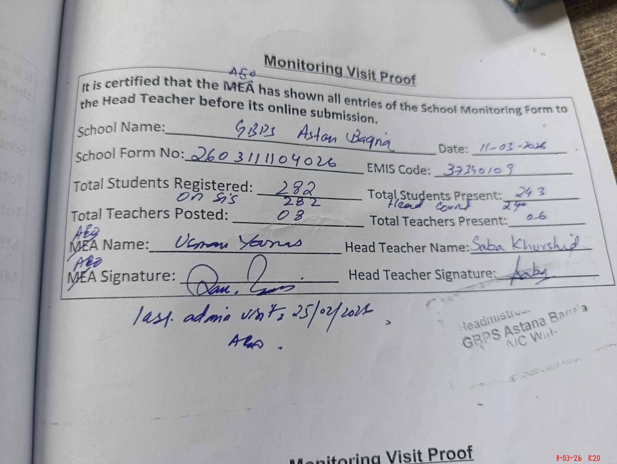 | Attendance Register | Head Teacher | MEA with School | Visit Proof |