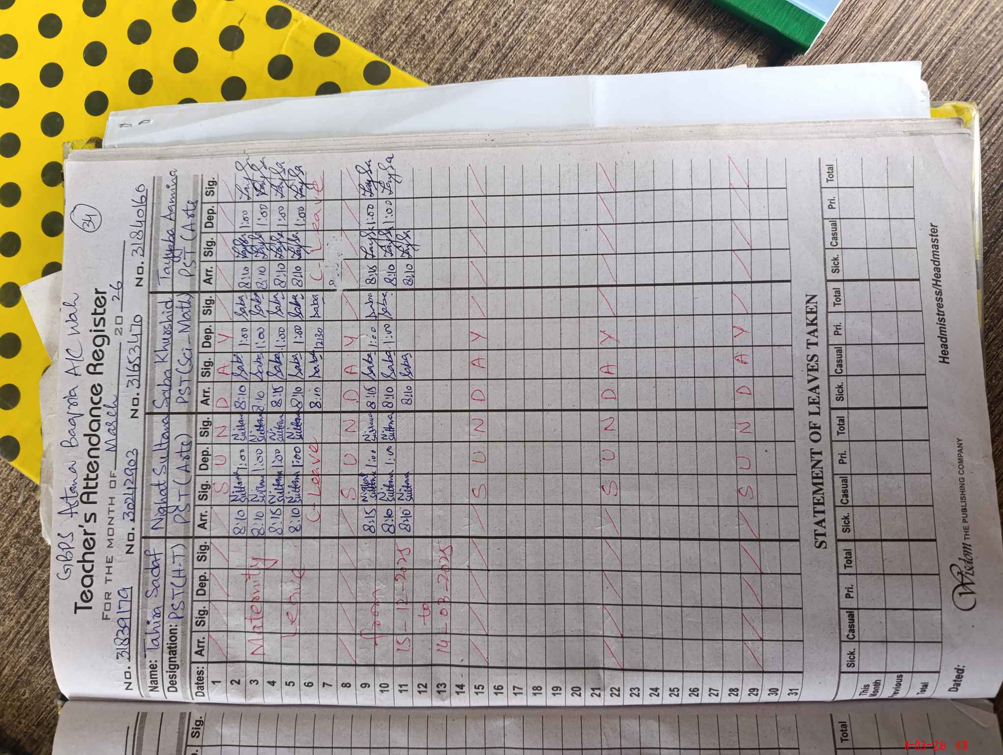 | 37**** | Fa**** Kh**** | PST Science/Maths | Regular | 0 | 0 | 0 | 0 | 0 | 0 | 0 | 0 | 0 | Maternity |