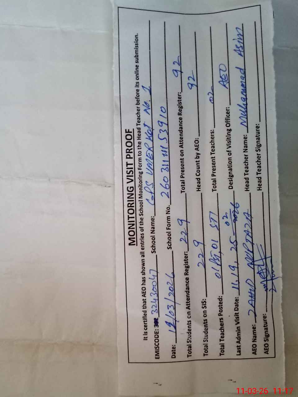 | Attendance Register | Head Teacher | MEA with School | Visit Proof |