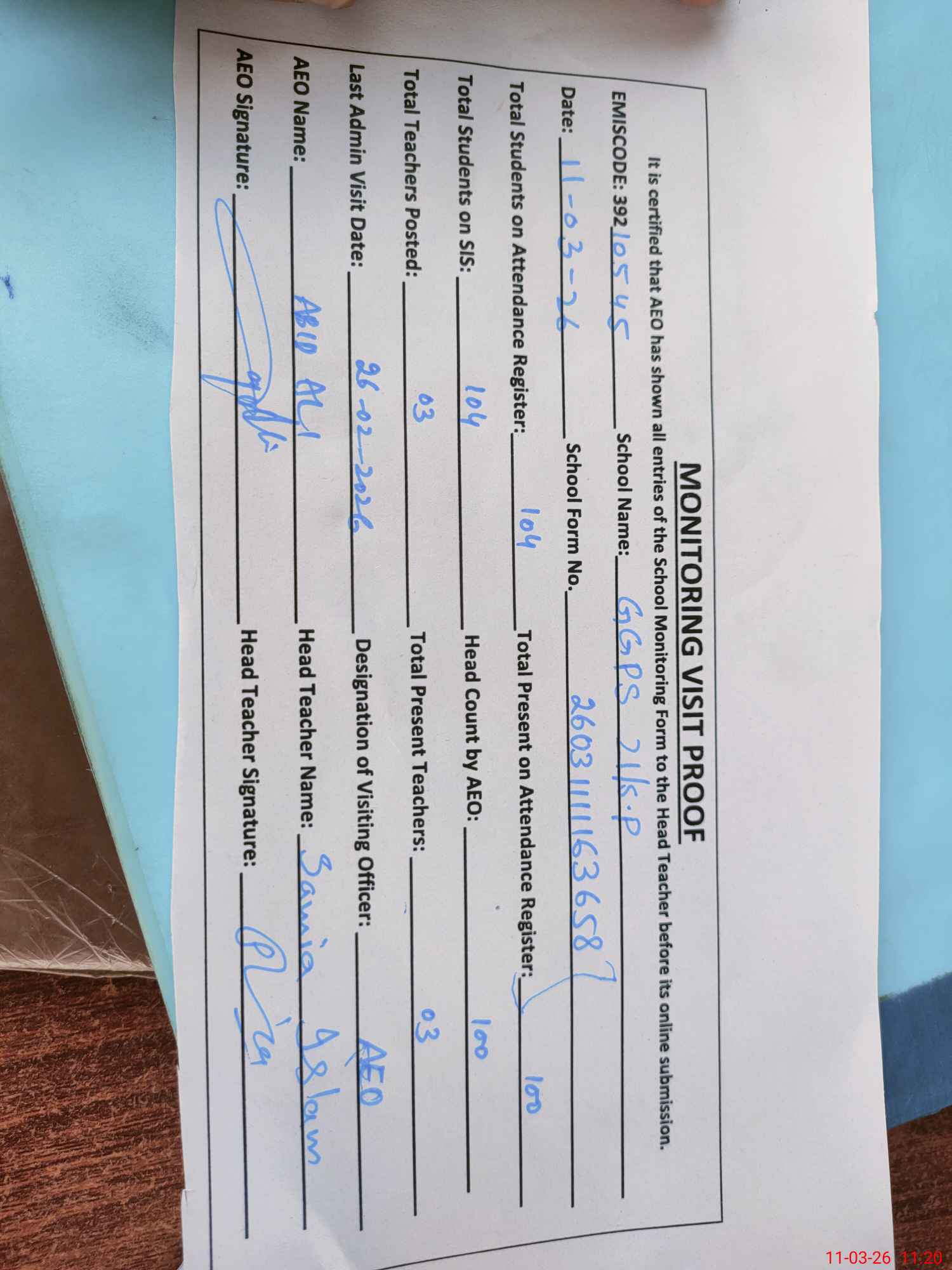 | Monitoring Date: 11-03-2026 | Start Time: 11-03-2026 10:59 AM | End Time: 11-03-2026 11:21 AM | Name of MEA: Ab**** Al**** | |