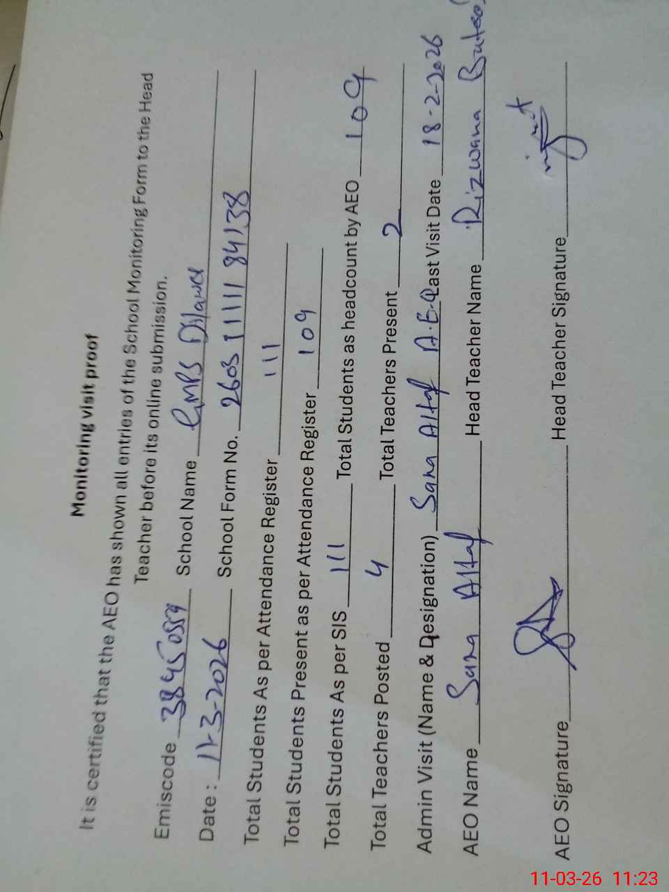 | Attendance Register | Head Teacher | MEA with School | Visit Proof |