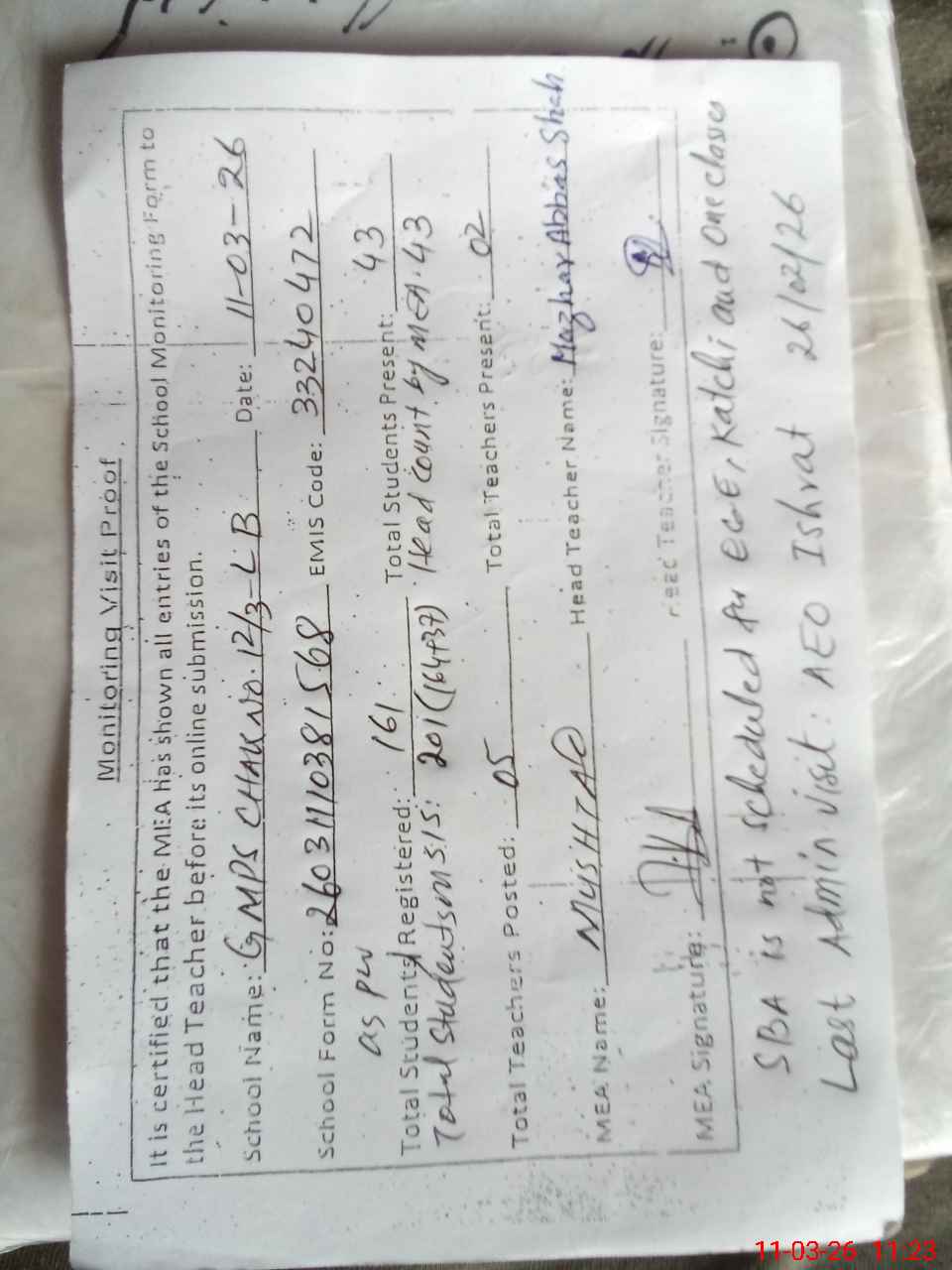 | Attendance Register | Head Teacher | MEA with School | Visit Proof |