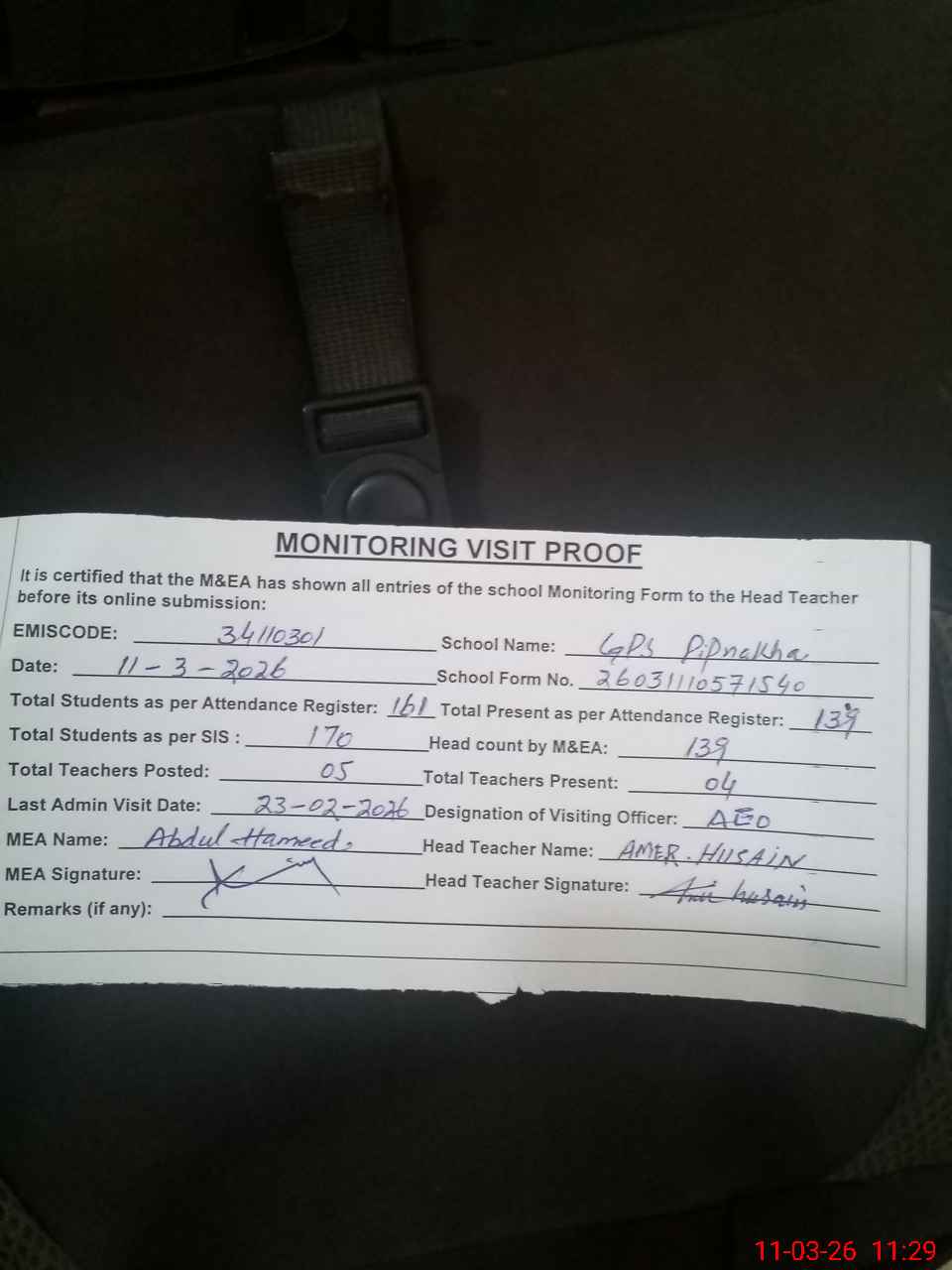 | Monitoring Date: 11-03-2026 | Start Time: 11-03-2026 10:55 AM | End Time: 11-03-2026 11:29 AM | Name of MEA: N-**** Ha**** | |