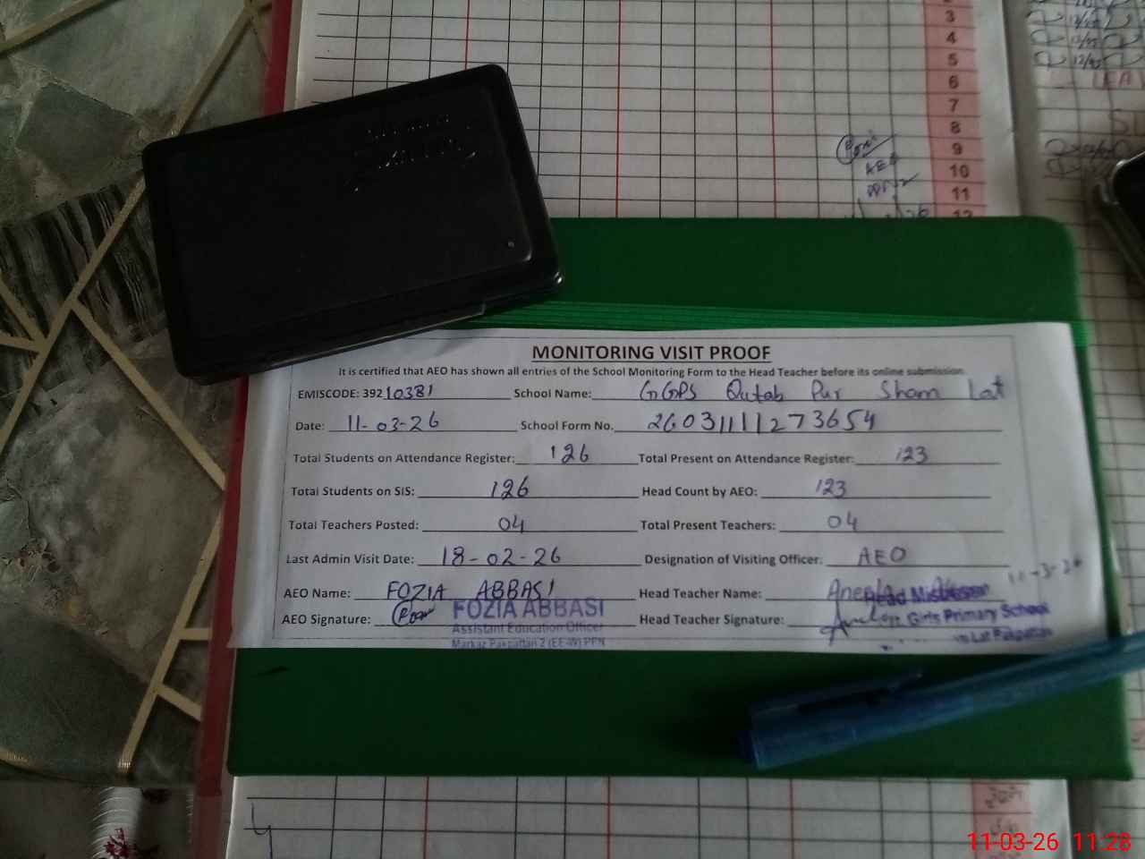 | Attendance Register | Head Teacher | MEA with School | Visit Proof |