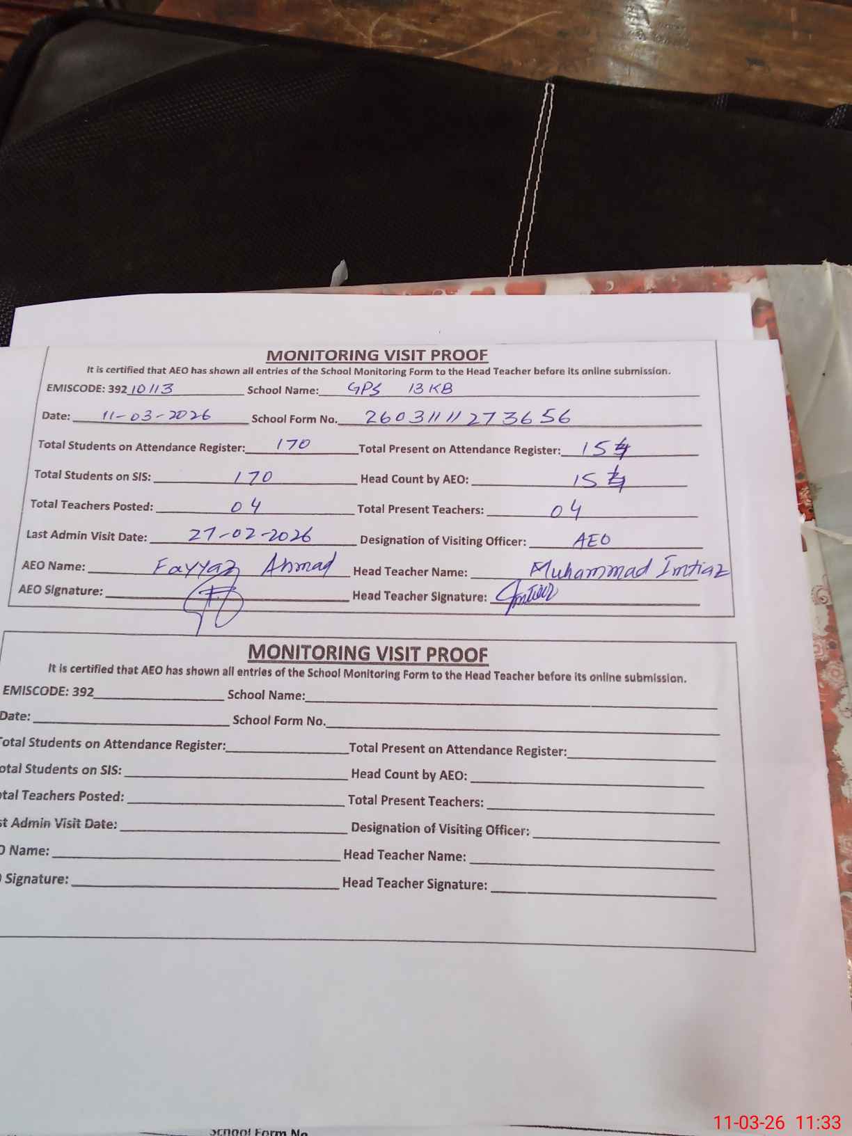 | Attendance Register | Head Teacher | MEA with School | Visit Proof |