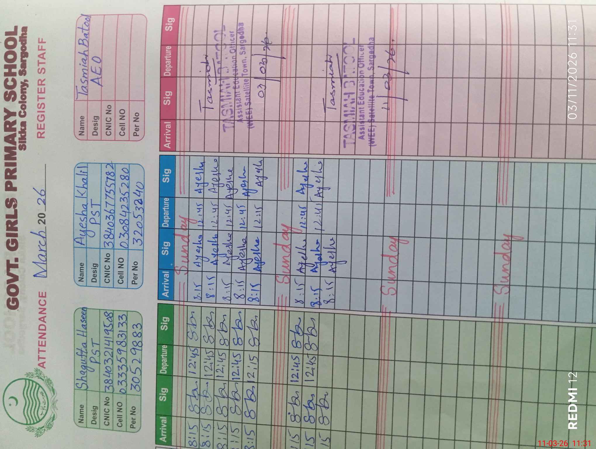 | Name: NA**** QU**** Designation: (School Headmaster's/Headmistress's) PST Phone/Cell Number: 03**** |