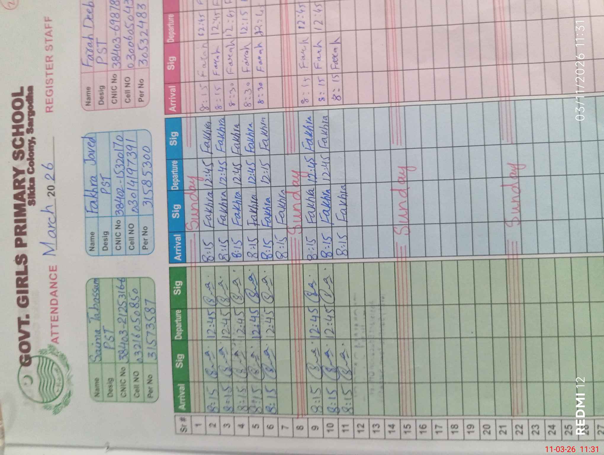 | CNIC | Full Name | Designation | R/C | Absence During Last Calender Month |