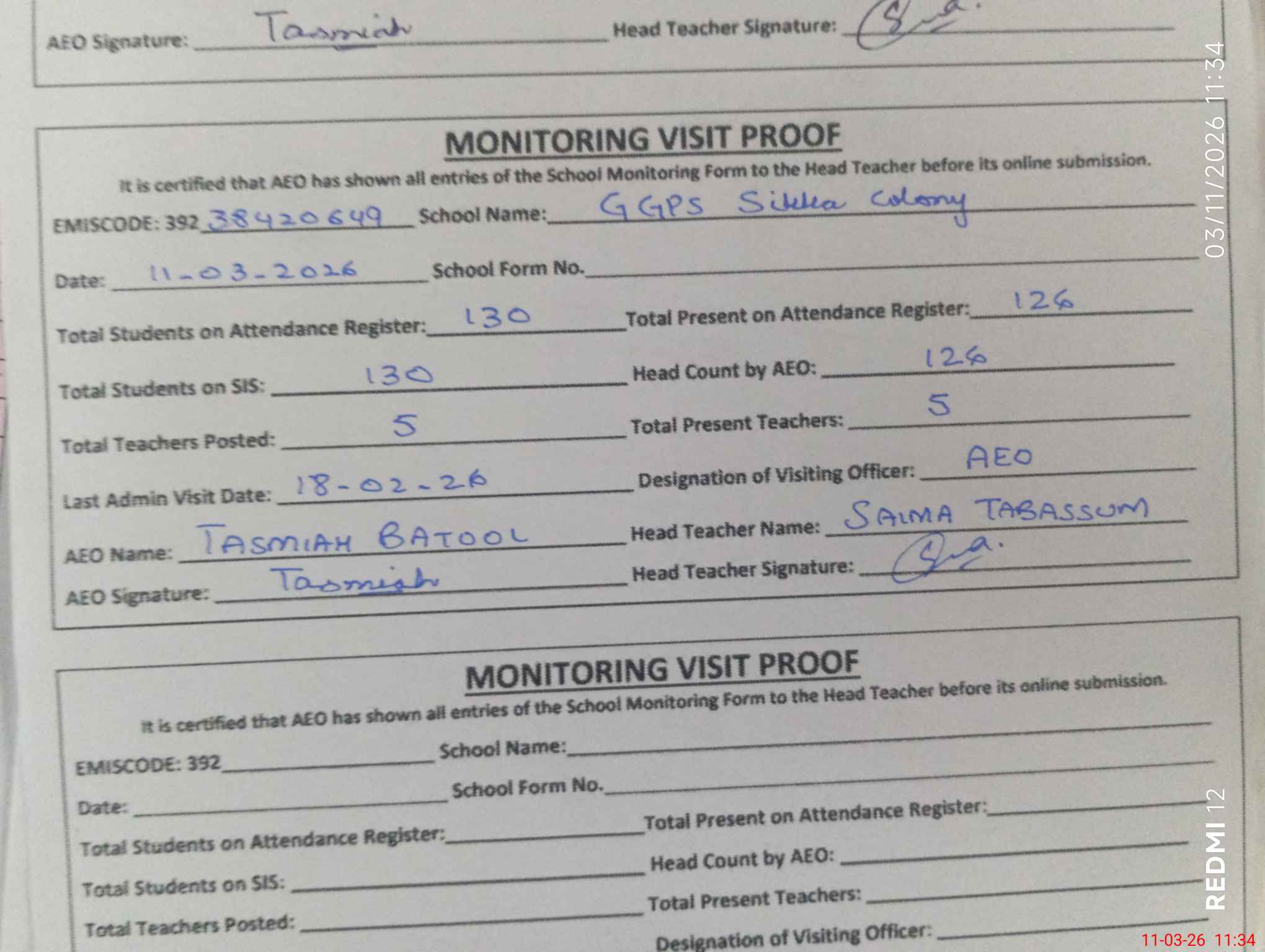 | Attendance Register | Head Teacher | MEA with School | Visit Proof |