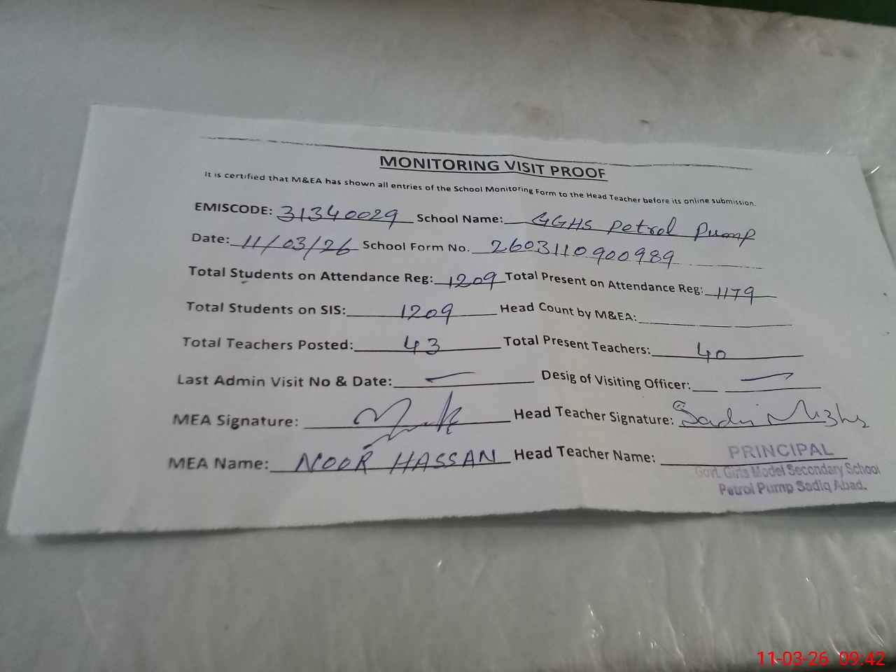 | Attendance Register | Head Teacher | MEA with School | Visit Proof |