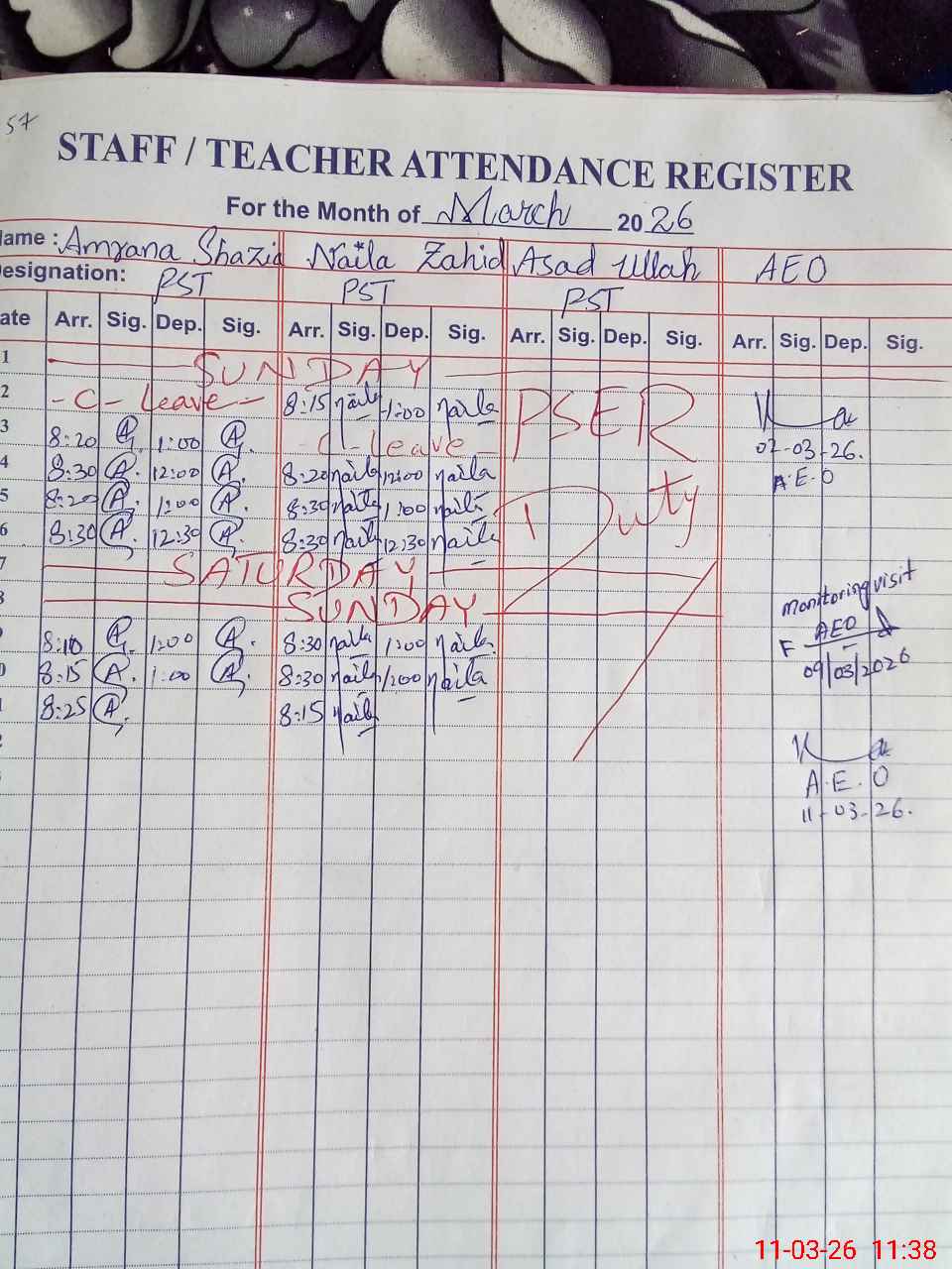 | Monitoring Date: 11-03-2026 | Start Time: 11-03-2026 11:21 AM | End Time: 11-03-2026 11:38 AM | Name of MEA: MU**** KA**** | |