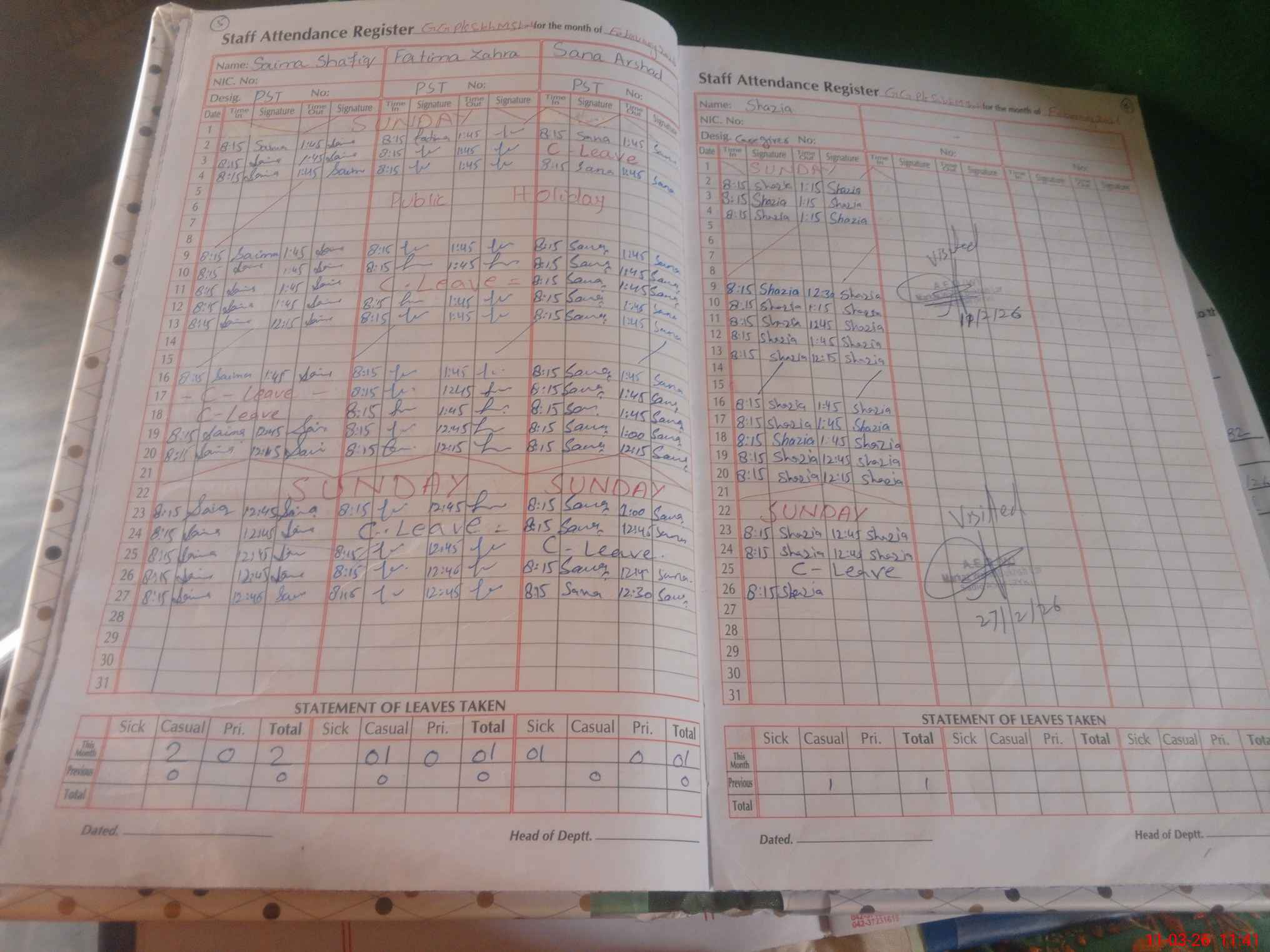 | Leave | Duty | Absent | Maternity | Medical | Ex- Pak |
