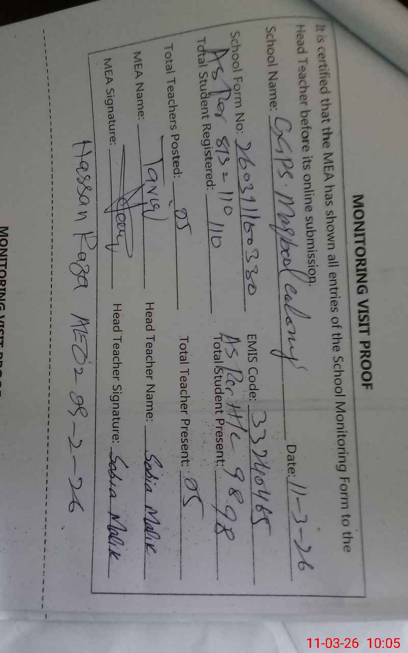 | EMIS Code: 33240465 | Name of School: GGPS MAQBOOL COLONY | |||