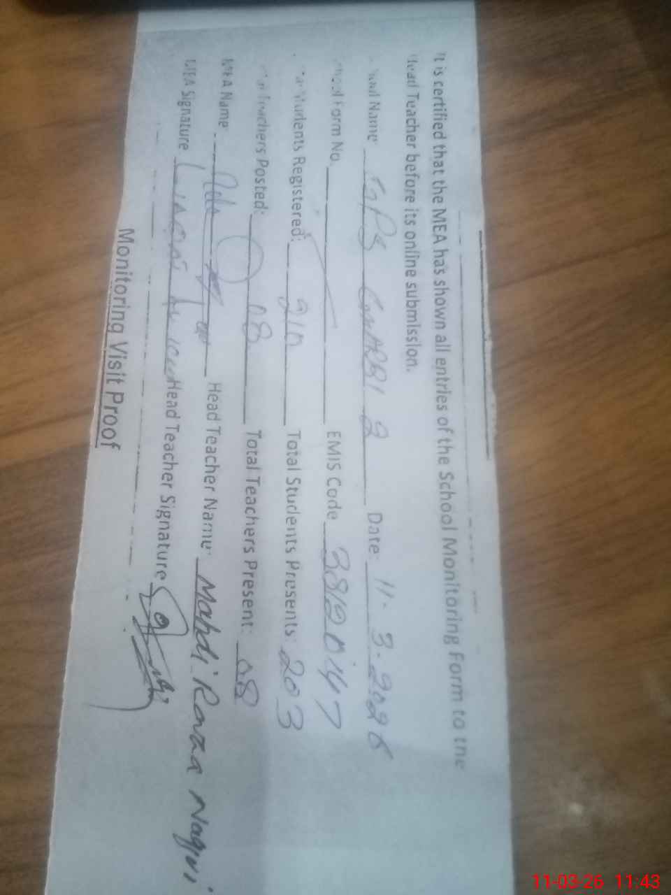 | Attendance Register | Head Teacher | MEA with School | Visit Proof |