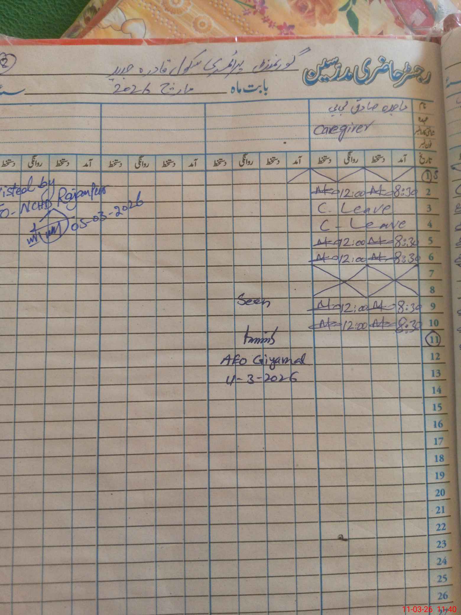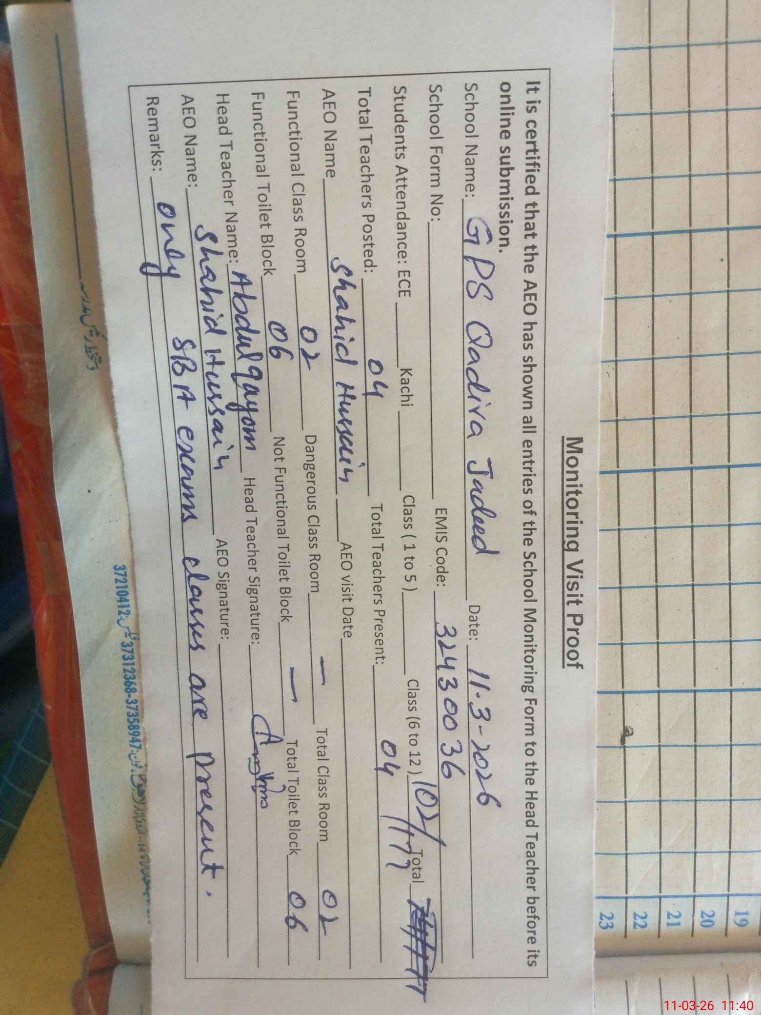 | Remarks (Use Separate Page if Required): Only SBA exams classes are present, other classes are on Holidays issued by Govt. of punjab SED. | |||||
