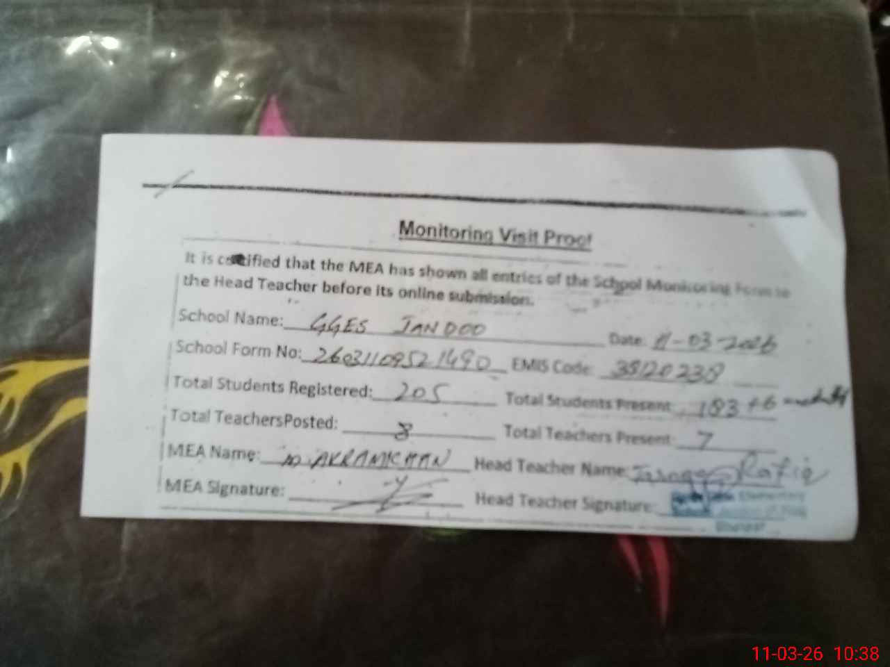 | Attendance Register | Head Teacher | MEA with School | Visit Proof |