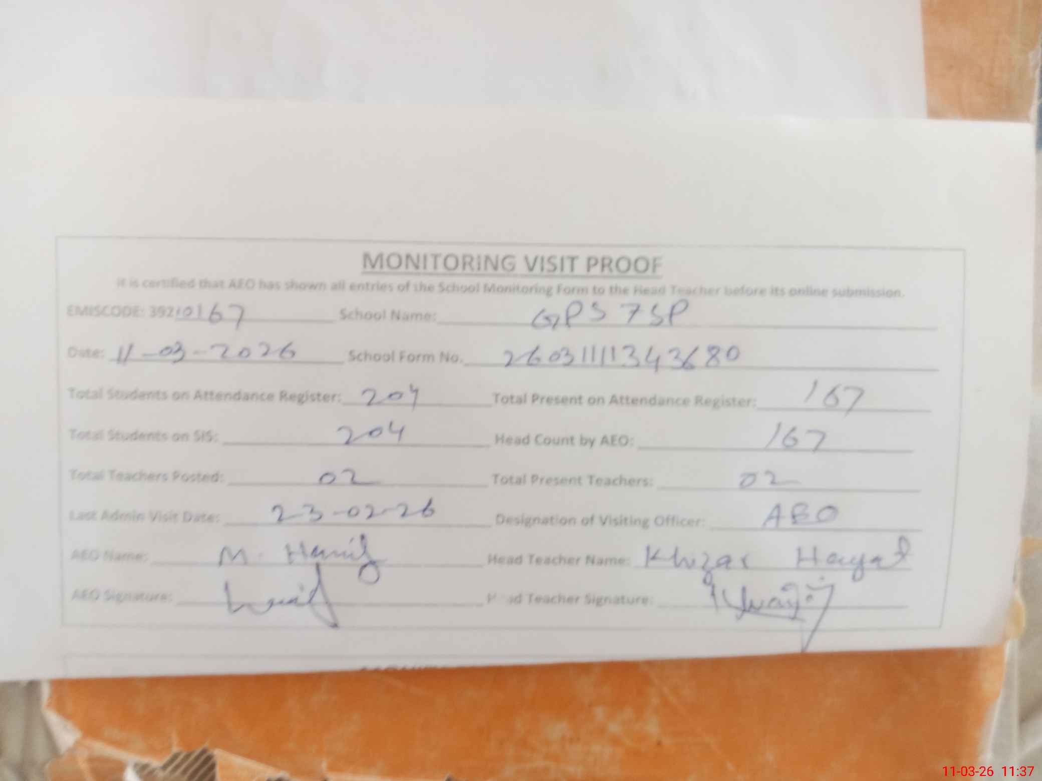 | EMIS Code: 39210167 | Name of School: GPS 7 SP PO MOLVI WALA PAKPATTAN | |||