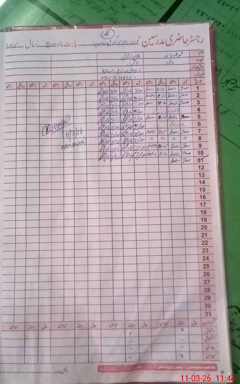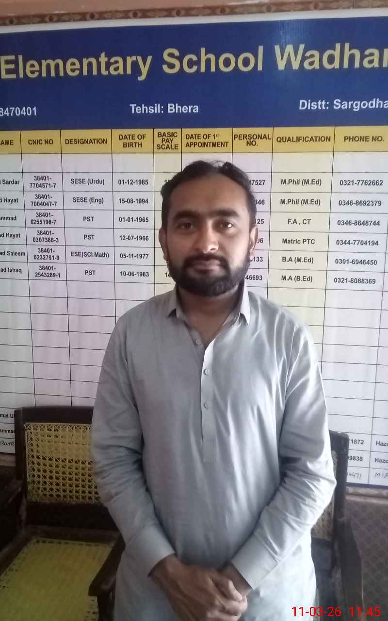 | Name: Qa**** Ha**** Designation: (School Headmaster's/Headmistress's) EST (English) Phone/Cell Number: 03**** |